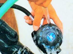 BCD内部には海水が入っている場合が多いです。パワーインフレーター排気ボタンを押しながら排気口にホースなどから流水を入れます。ある程度入れたらオーラルインフレーションでBCDを膨らませ、上下左右に振って内部の海水をしっかりと洗います。最後にBCD内部に入れた水を抜いてあげて仕上げです。