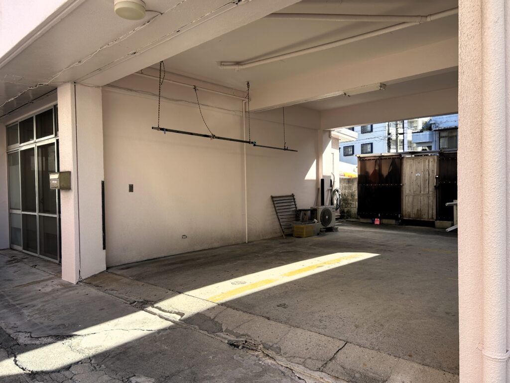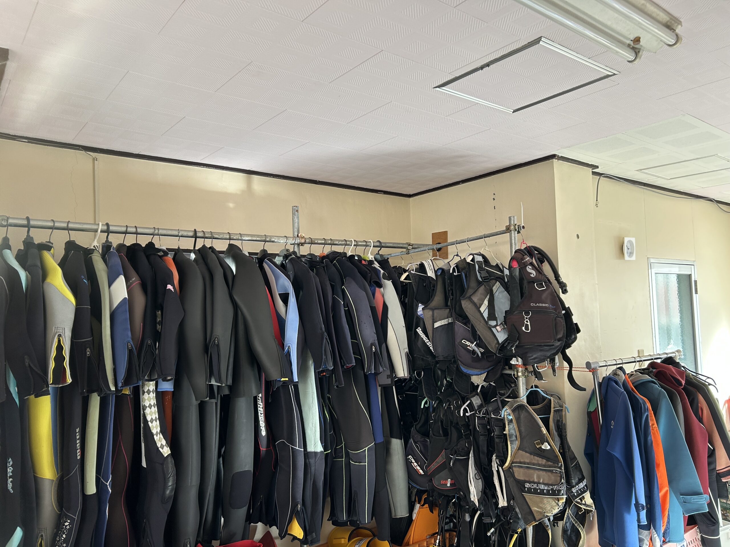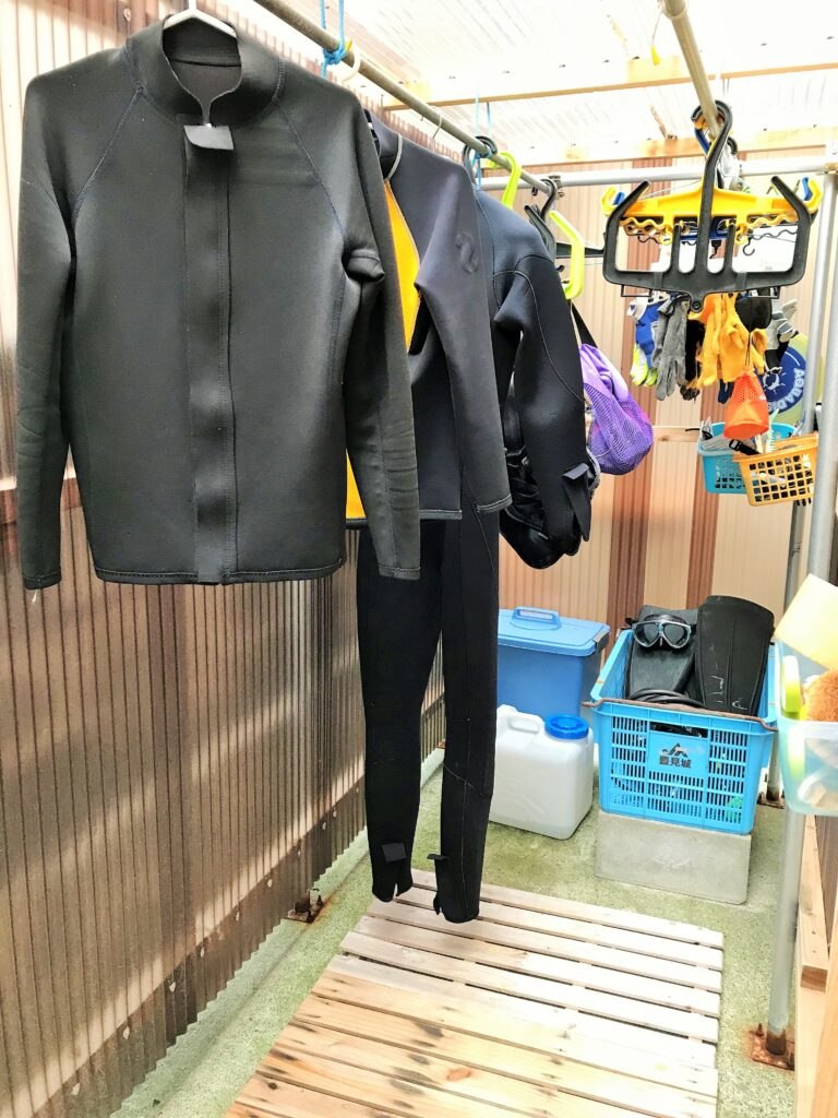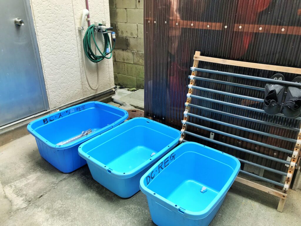 店舗の外に器材倉庫があります。器材を洗ってすぐに濡れたまま干せます。ゲスト様の器材をお預かりし乾燥させてからご自宅への発送サービスもございます